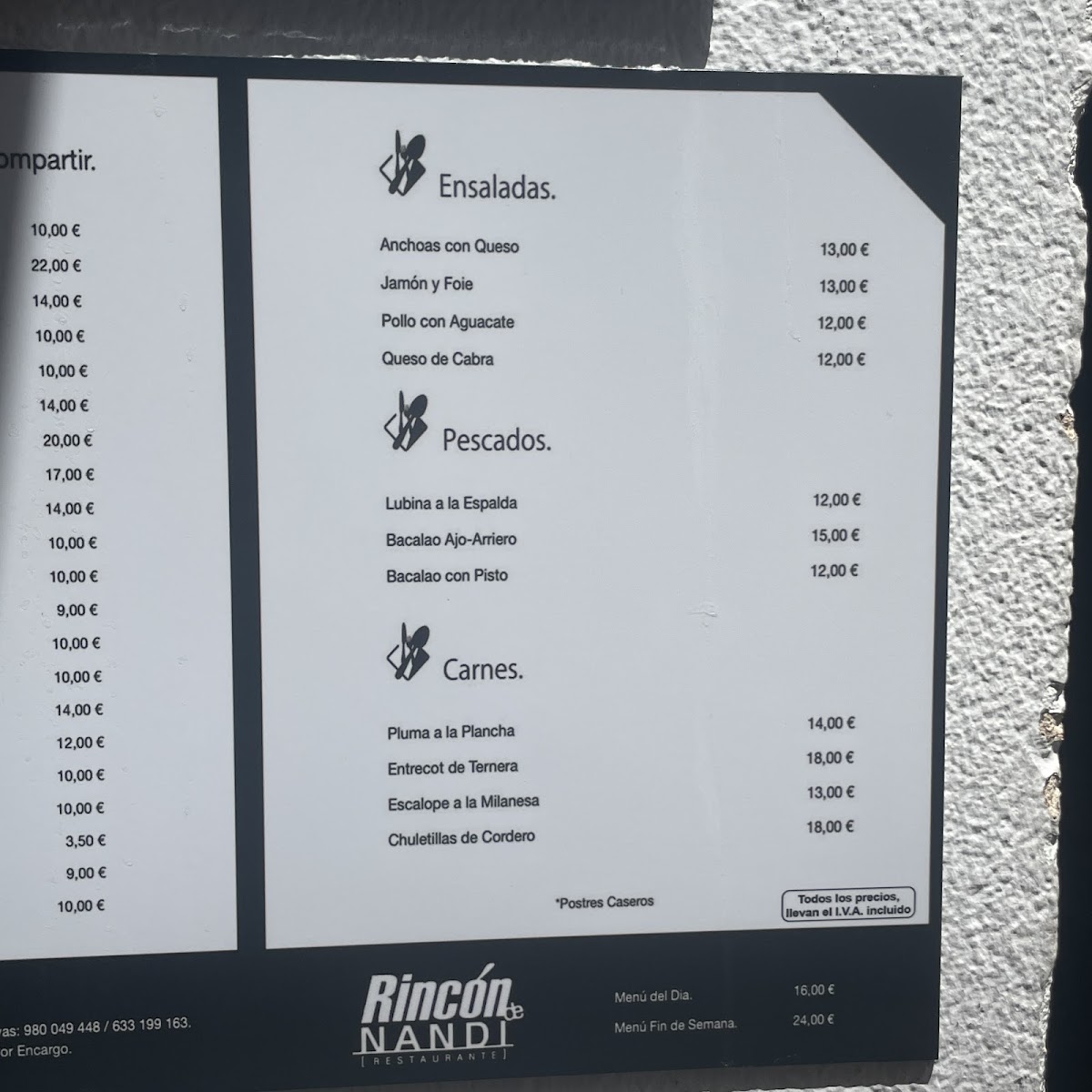 The menu at Rincón De Nandi offers a delightful variety of traditional Spanish dishes, showcasing the rich flavors of the region. A standout on the menu is the Lubina, a perfectly grilled fish that highlights the freshness and quality of the ingredients. For dessert, the Flan is a must-try, offering a creamy and smooth texture that perfectly balances sweetness with subtle caramel undertones. The Escalope, a breaded and tender meat dish, provides a satisfying and hearty option for those craving something savory. With its well-executed dishes, Rincón De Nandi delivers a memorable dining experience that reflects the essence of Spanish cuisine, offering both light and filling options that cater to a variety of tastes. Whether you're in the mood for seafood, meat, or a sweet ending, the menu has something to satisfy every palate.